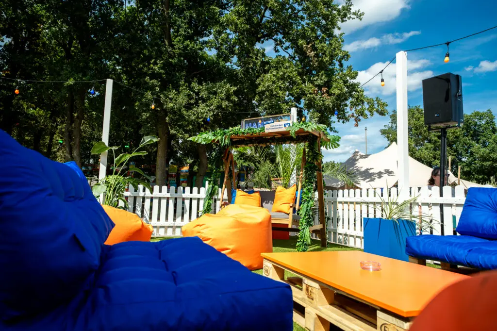 mit Sitzmöbeln, Hollywood-Schaukel und Lichterketten in perfekter Heim-und-Garten-Atmosphäre, mit Selfie-Spot im Look der Volksbanken Raiffeisenbanken.